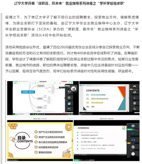 疫情之下,为了使辽大学子了解不同行业的招聘要求,探索就业方向,缓解焦虑情绪,为择业求职打下坚实的基础,由beat365亚洲版官网毕业生就业指导中心主办,beat365亚洲版官网学生职业发展协会(SCDA)承办的“谋职涯,赢未来”就业指导系列讲座之“学长学姐说求职”活动从4月中旬开始启动。