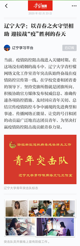 2月23日,“学习强国”辽宁学习平台以“beat365亚洲版官网:以青春之火守望相助 迎接战‘疫’胜利的春天”为题,对我校青柠檬网络文化工作室青年突击队先进事迹进行了详细报道。现将报道截图转载如下:
