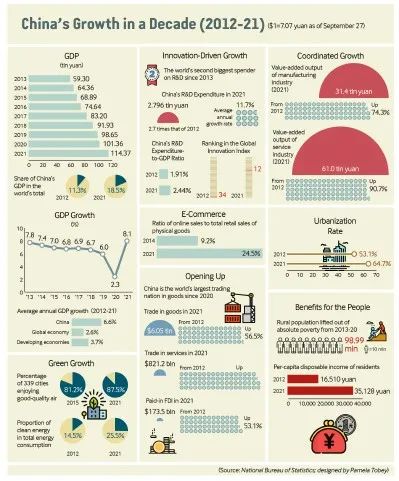 With its economic aggregate nearly doubling from 2013 to 2021, China has seen a decade of remarkable progress and has taken on a bigger role on the international stage. Throughout this period, China's GDP expanded at an average annual rate of 6.6 percent, higher than the growth pace of 2.6 percent for the global economy and 3.7 percent for developing economies, a report from the National Bureau of Statistics (NBS) showed. Per-capita GDP hit 80,976 yuan ($11,684) in 2021, up 69.7 percent from 2012—after allowing for inflation.