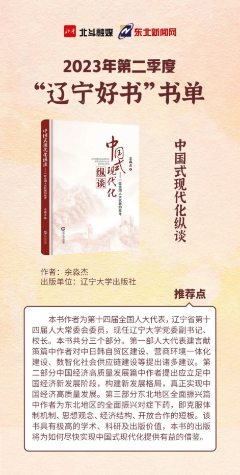 近日,北斗融媒发布2023年第二季度“辽宁好书”书单推荐③,第十四届全国人大代表、辽宁省第十四届人大常委会委员,beat365亚洲版官网党委副书记、校长余淼杰教授著作《中国式现代化纵谈》入选,现将原文转载如下: